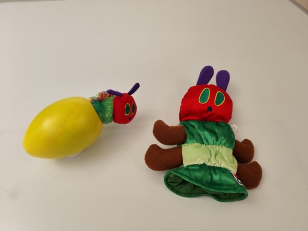 Darüber hinaus wurde die Geschichte nachgespielt, was den Kindern half, sich noch intensiver mit dem Inhalt auseinanderzusetzen. Die Schülerinnen und Schüler konnten auch ihrer Kreativität freien Lauf lassen: Sie bastelten eine Stofftierraupe und gestalteten das Buch neu. Dabei schnitten sie die Früchte in zwei Teile, um damit die Seiten des Buches zu bedrucken.