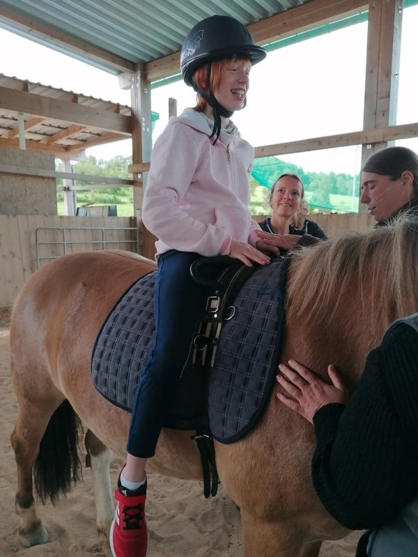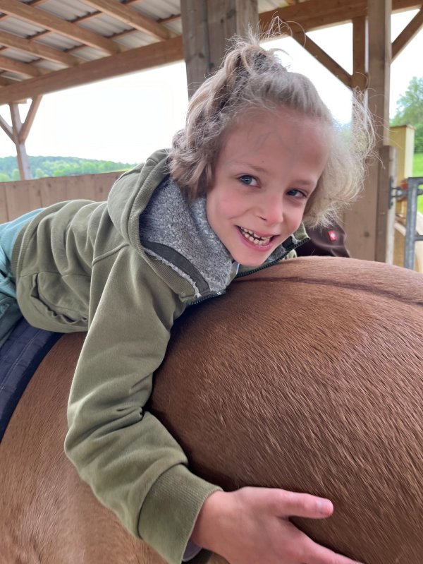 Mutig, wie wir ihn kennen, ließ sich Lennox trotz und mit seiner Hörsehbehinderung auf das Reiten ein. Lea ist schon erfahren und trug stolz ihre eigene Reithose und natürlich Helm. Aus dem Rolli in den Sattel ließ sich auch Lucas helfen und alle waren erstaunt, wie aufrecht er saß und wie sicher er sich festhielt. Auch Evan vom Titelbild legte sich nach einer ausgiebigen Annäherung so entspannt auf Cinderella, dass er mit den Bewegungen des Pferdes im Einklang war.