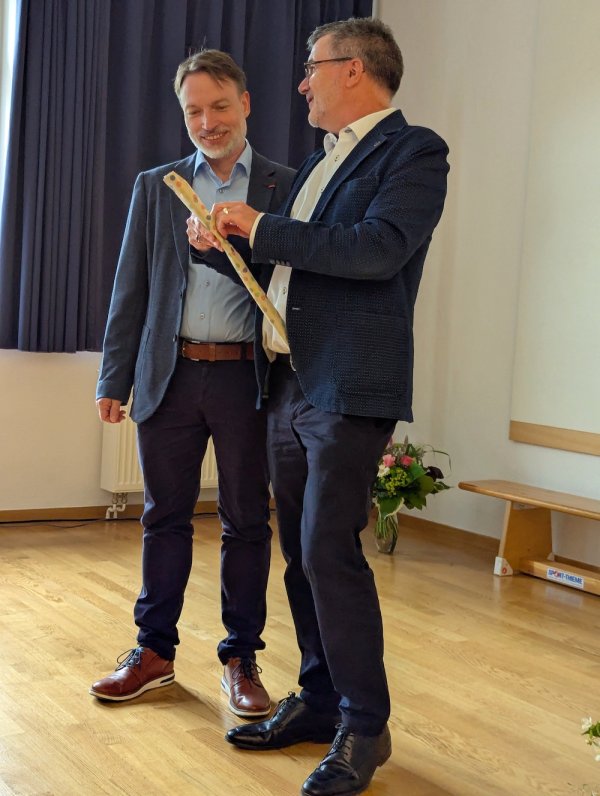 Herr Spielmann überreichte Herrn Garten zum Antritt einen Taktstock und verglich die neue Aufgabe mit der eines Dirigenten: alle im Orchester sind wichtig, selbst der Musiker, der nur an einer, aber passgenauen Stelle, die Triangel spielt – auf das gute Zusammenspiel kommt es an! Sein Bild vom Orchester und dem Dirigenten unterstrich er mit einem Zitat von Robert Lembke: „Die Fähigkeit eines Chefs erkennt man an seiner Fähigkeit, die Fähigkeiten seiner Mitarbeiter zu erkennen.“