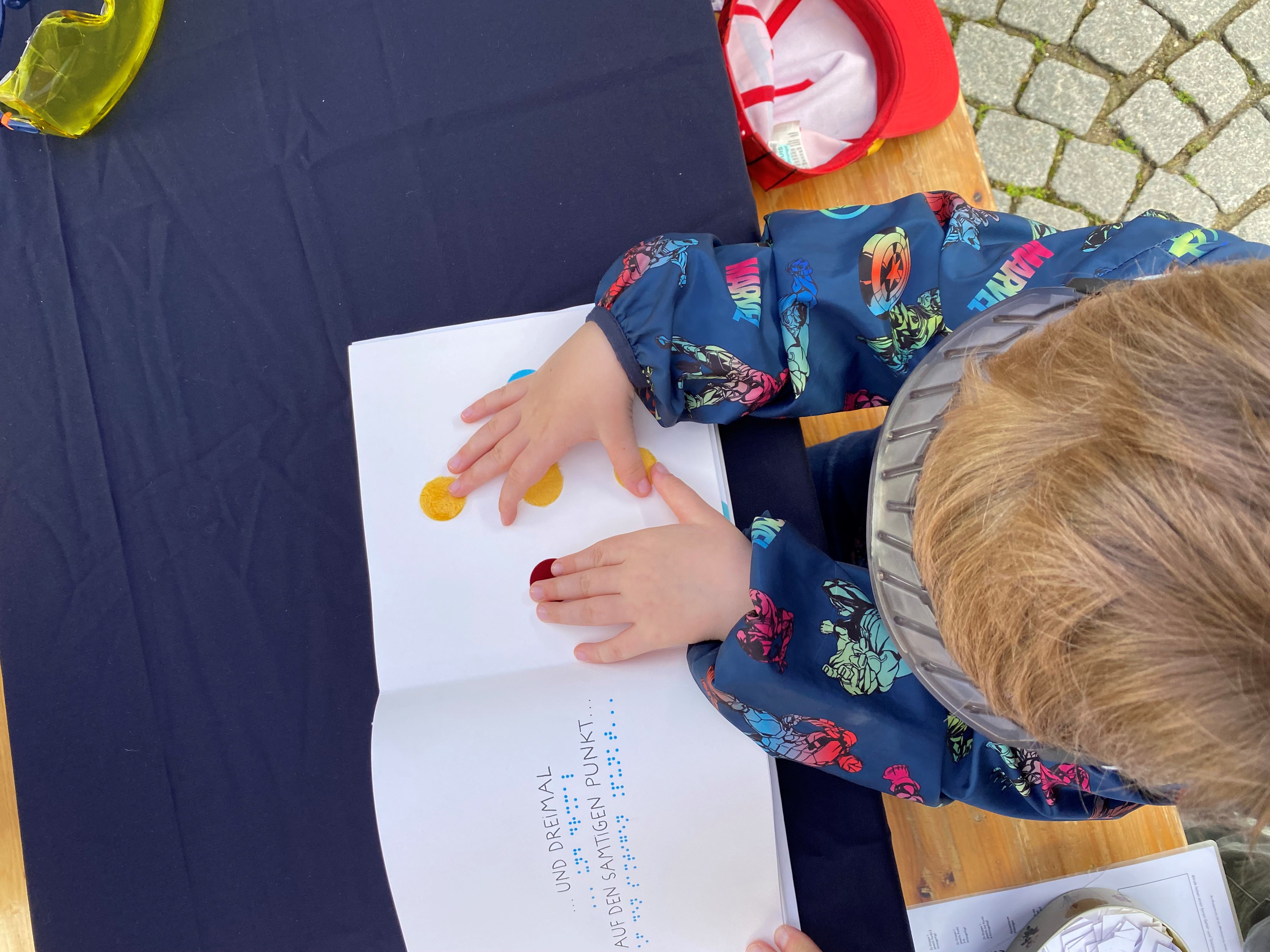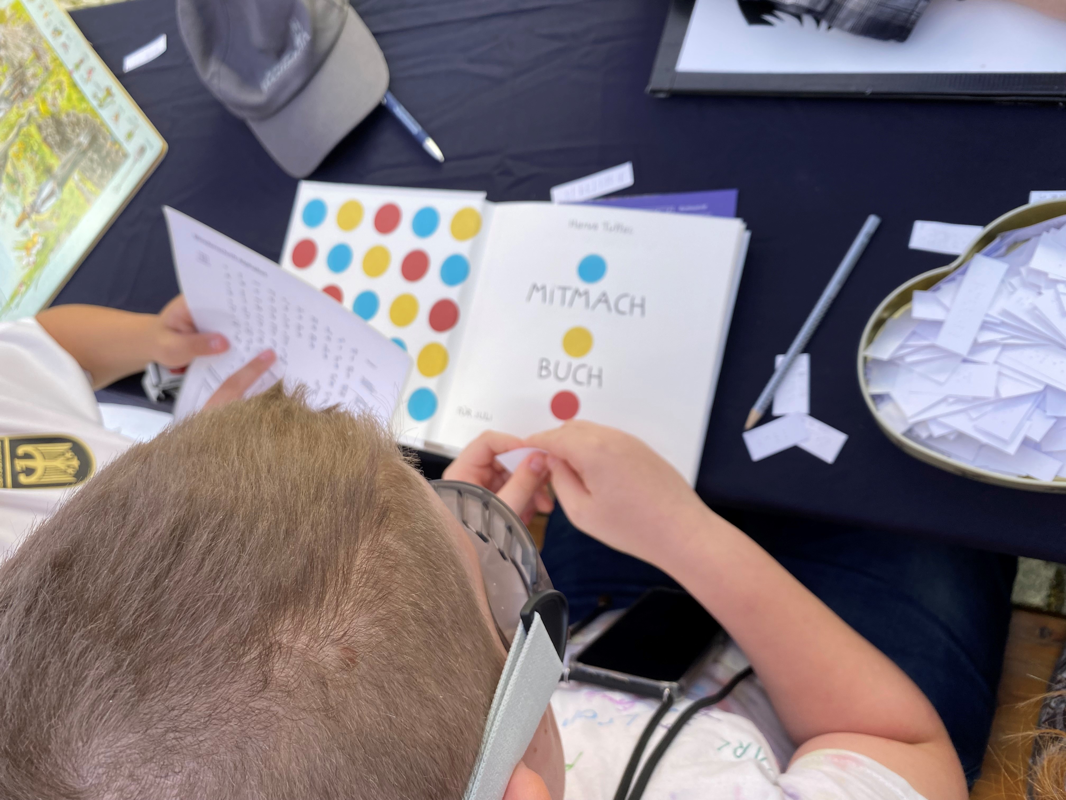 Kleine Selbsterfahrungsübungen unter der Simulationsbrille, Fühlbücher und Informationen rund um die Blindenschrift kamen vor den Dunkel-Containern gut an und überbrückten die Wartezeit.