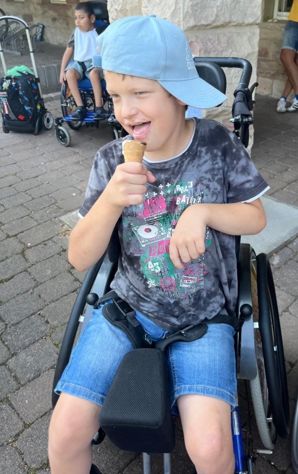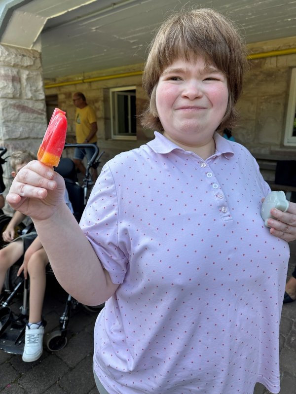Für alle großen und kleinen Menschen von der Schule war das ein perfektes Ende des Schultages, für unsere Erwachsenen ein leckeres Vesper und für die Mitarbeiterinnen und Mitarbeiter ein toller Dienstbeginn oder ein schönes Dienstende oder eine frische kleine Pause zwischendurch. Eis verbindet, auch das war schön zu sehen, denn im nu bildete sich eine Traube Menschen und man kam mit oder ohne Lautsprache ins Gespräch. Und ganz oft war zu hören „Super, Alex!“