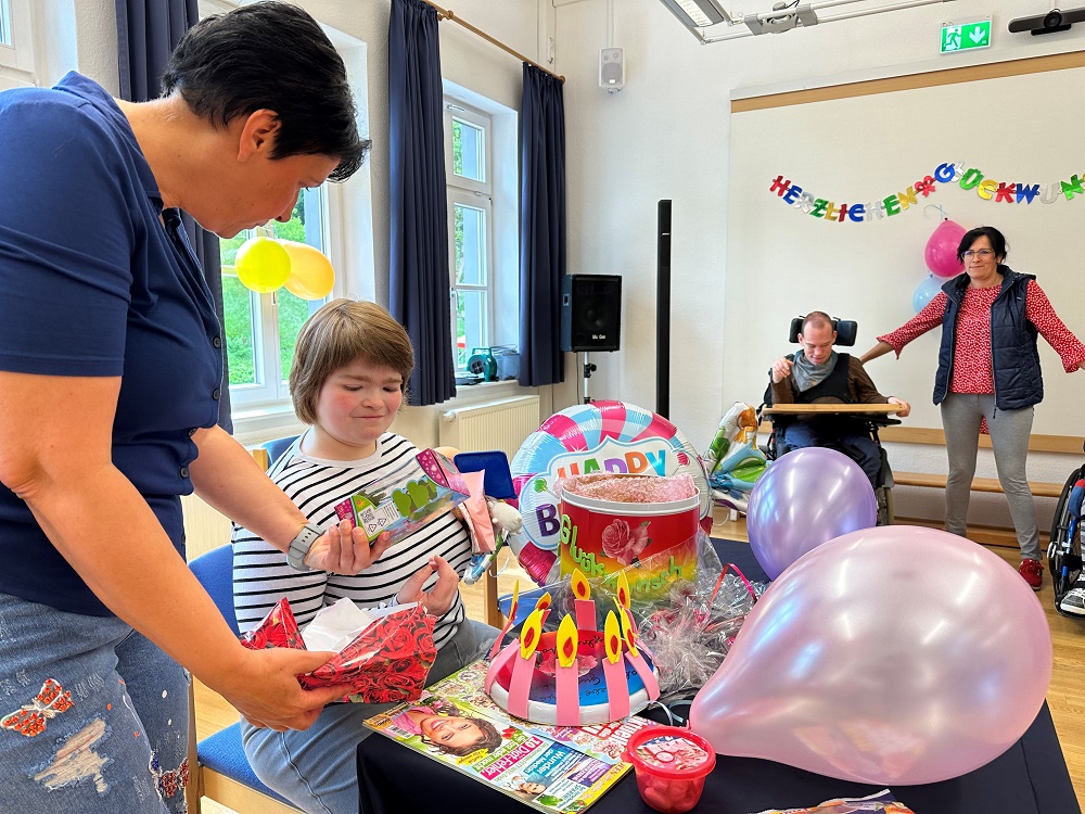 Zur Party lud sie Freunde und Freundinnen aus dem Haus und die Party in der Aula begann mit dem Lied „Wie schön du bist“ von Sarah Connor. Nach dem wirklich passenden Song ging es flotter weiter und schnell bildeten sich ganz unterschiedliche Tanzpaare. Wunschmusik von den „Kastelruther Spatzen“ durfte natürlich nicht fehlen; genauso wenig wie der große bunte Geschenktisch, der später in die Aula gefahren wurde.