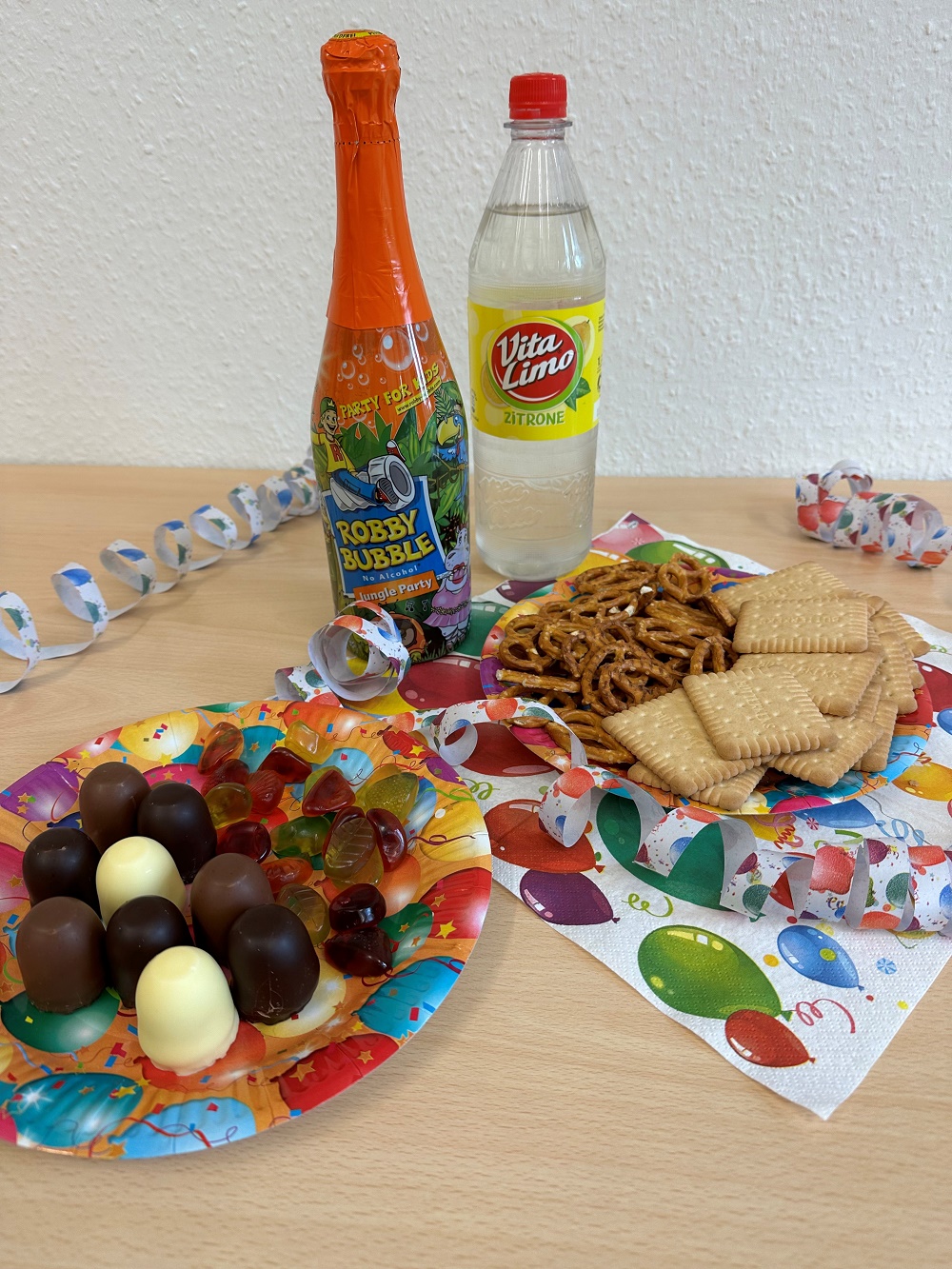 Eine große runde Box, von Ronjas Eltern ins Blindi geschickt, verbarg allerlei Geschenke, die nacheinander ausgepackt und bestaunt wurden. Unter anderem gab es eine neue Puppe, die, so Ronjas Kommentar „sieht aus wie die Jessica“ (Jessica gehörte zu den Partygästen und wohnt ebenfalls im Erwachsenbereich). Bei Knabbereien und Getränken wurde noch etwas weiter gefeiert… und wer war der erste an der Bar? Alexander, aber er hatte ordentlich mit Herrn Horny getanzt.