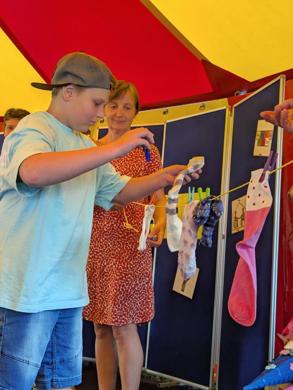 Vor allem der Sockensketch überzeugte: jeder Schüler teilte dem Publikum mit, was er besonders gut kann und hängte dabei eine Socke an eine Leine. Von „ich kann gut lesen“ über „ich kann gut fädeln“, bis „ich kann gut Rasen mähen“ war alles dabei, und es wurde deutlich, was die Schüler für „coole Socken“ sind.