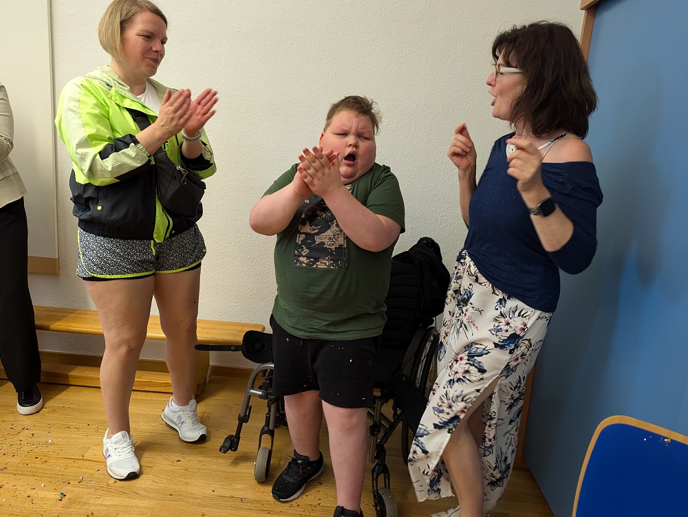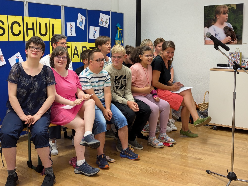 Der Schulstart wird bei uns im Blindeninstitut Thüringen jedes Jahr für und mit allen ordentlich gefeiert. Besondere Aufmerksamkeit haben dabei natürlich die Schulanfänger*innen und die Schülerinnen und Schüler, die neu an unserer Schule lernen. Damit alle mitfeiern können, war die Feierstunde im Zelt geplant, aber der nicht aufhören wollende Regen zwang uns in die Aula. Da wurde es eng und manchmal ganz schön laut, aber am Ende hatten alle ihren Spaß!