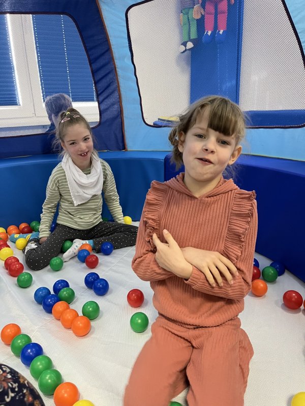 Später wurde dann auch die Frage geklärt, woher das große Spielzeug kommt. Familie Kramm, das sind die Eltern und Geschwister von Lukas, der in der Klasse lernt, haben es gespendet und in geheimer Absprache mit den Pädagoginnen nach Schulschluss in die Klasse gebracht. Als Dankeschön gab es ein Kaffeetrinken mit Familie Kramm in der Schule und einen runden Kuchen, der mit vielen bunten Smarties bestückt, dem Bällebad ähnelte. Hier gibt es kein Foto mehr, denn er war ganz schnell verputzt. Ein großes Dankeschön an Familie Kramm für das tolle Geschenk!