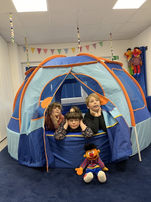Die Tür zum „blauen“ Klassenraum war verschlossen und Spannung lag in der Luft. Irgendetwas Geheimes muss sich hinter der Tür verbergen. Ein vorsichtiges Öffnen gab den Blick auf ein großes halbrundes Ding frei. Was ist das und wie ist es über Nacht in unsere Schule gekommen? Die zweite Frage war kaum noch interessant, denn das Teil wurde von den Schülerinnen und Schülern sofort erobert. Bällebad, Zelt, Hüpfburg, Sitzgruppe, Spielwiese, Versteck, ein Haus für Ernie und Bert (die Klassenmaskottchen) - die Möglichkeiten sind verrückt viele und der Schultag war mit Ausprobieren voll.