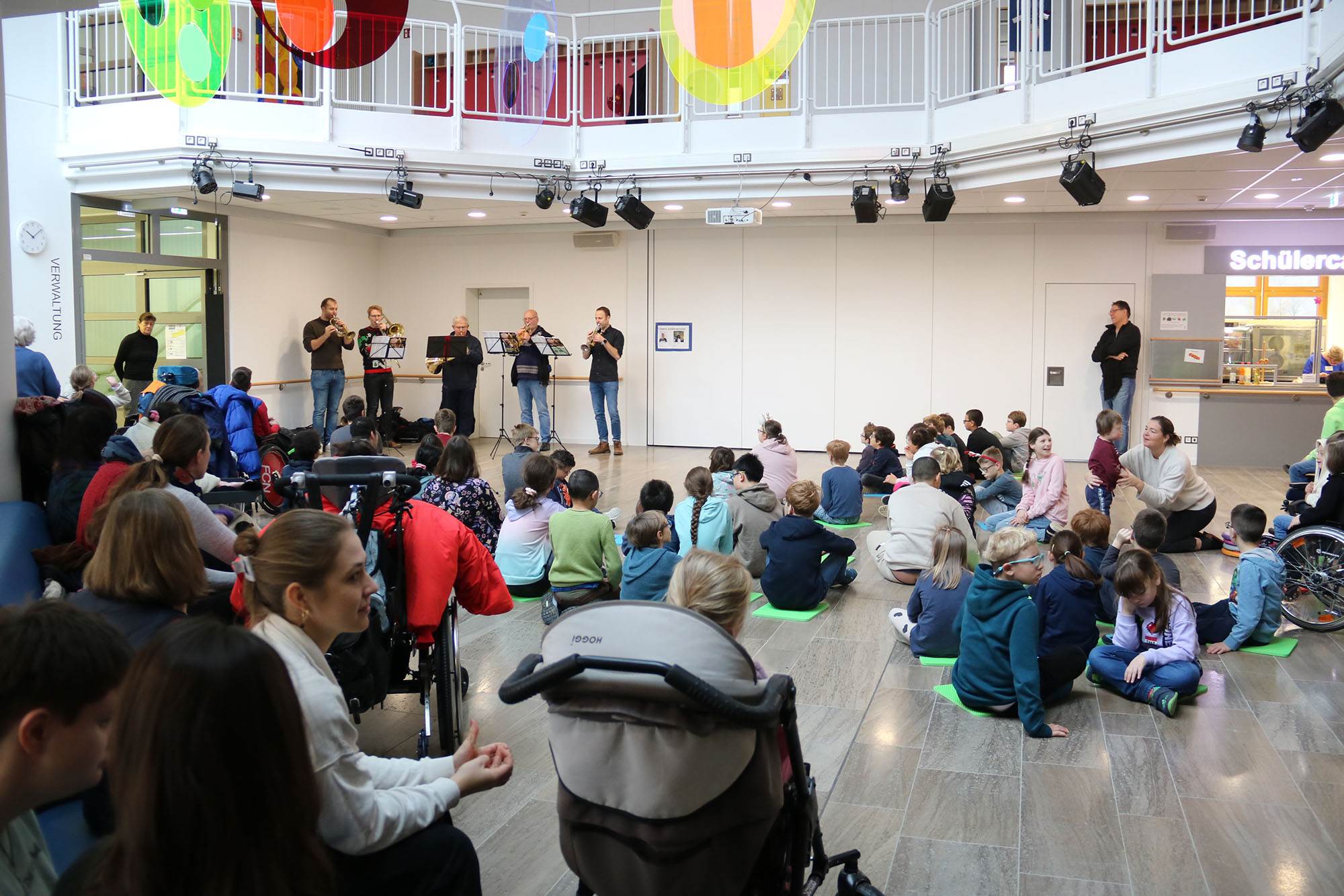 Klassische Weihnachtslieder wie Alle Jahre wieder, Oh du fröhliche, Ihr Kinderlein kommet standen auf dem Programm, aber auch bei We wish you a merry Christmas lauschten, summten und klatschten die kleinen und großen Zuhörer*innen begeistert mit. Als dann eine jazzige Version von Leise rieselt der Schnee zu hören war, rief das erstaunte Gesichter hervor. Der anschließende Beifall zeigte die große Freude, die das geschenkte Konzert bereitete. Und ganz neugierige Konzertbesucher durften die Instrumente im Anschluss sogar abtasten.