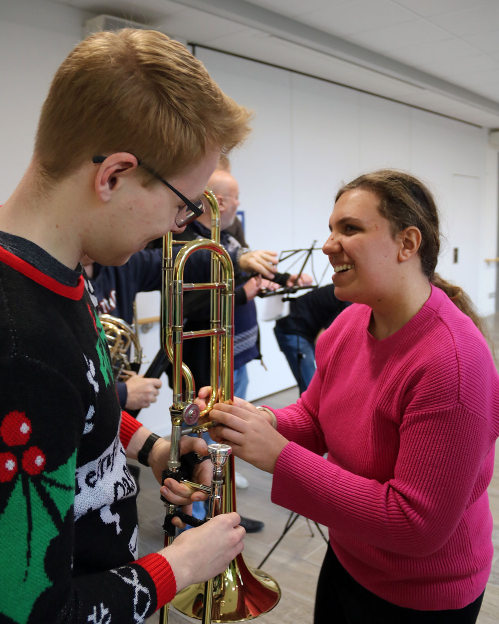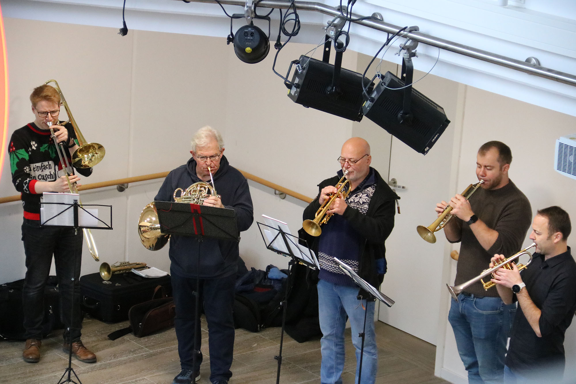 Mit fröhlichen, jazzigen und auch ruhigen Tönen überraschte das Blechbläserquintett des Mainfranken Theaters auch in diesem Jahr die Kinder, Jugendlichen und erwachsenen Klient*innen im Blindeninstitut Würzburg. Die Musiker versüßten in schöner Tradition mit Trompete, Posaune und Waldhorn die Adventszeit mit zwei kleinen Live-Konzerten in der Bentheim Werkstatt und der Graf-zu-Bentheim-Schule.